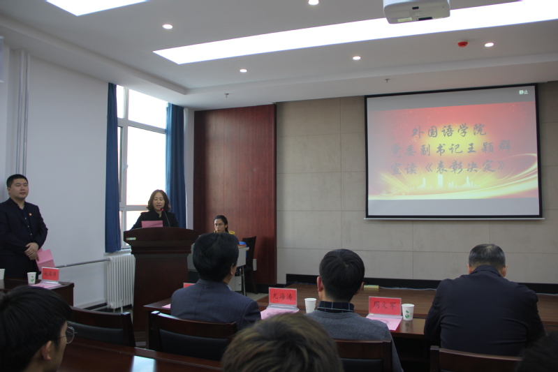 (通讯员 刘忠超)为进一步总结学风建设的成绩和经验,表彰宣传在学风建设中表现突出的先进集体和优秀个人,让全体学生学有榜样、赶有目标。12月31日下午,外国语院在学院会议室举办2019年度学团工作表彰大会暨“外语节”艺术展演。校党委副书记李雁冰,校党委学生工作部部长周文军,校团委书记仲崇利,学院党委书记尤海涛,院长彭又新,党委副书记王颖群及英、日、俄语系主任出席本次大会。表彰大会由学院团委书记赵海涛主持,大会一共有四项内容。