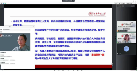 会议上,大连外国语大学副校长常俊跃教授作了《新文科建设背景下外语专业区域国别学人才培养:思考与探索》的演讲,从外语类学科建设的现状出发,指出为适应新时代国情需要,外语学科建设应当注重外语专业区域国别学人才培养。而湖南师范大学pg娱乐电子游戏官网入口院长曾艳钰教授和长春师范大学pg娱乐电子游戏官网入口党委书记兼院长马建华教授,分享了各自在外语学科建设,和复合型外语人才培养等方面做出的努力。