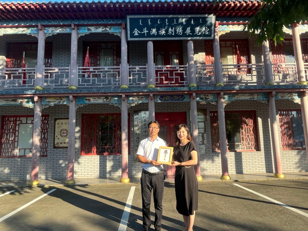 金斗小学校长李龙向院长王轶赠送满绣作品