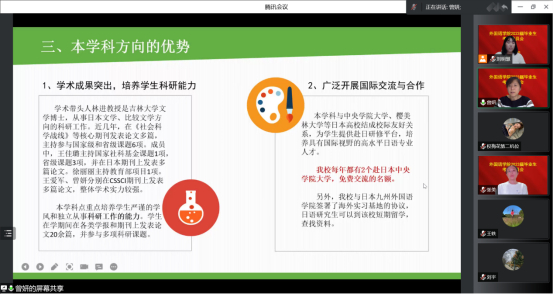 接着,曾妍从师资力量、课程设置、学科优势、学生就业和关于考研这五个方面详细地介绍了日语语言文学方向的情况。此方向的优势:一是学术成果突出,培养学生的科研能力;二是我校与日本高校广泛开展国际交流与合作,能够为学生提供很好的赴日留学机会,她鼓励同学们报考母校,还为同学们送上了学姐的祝福。