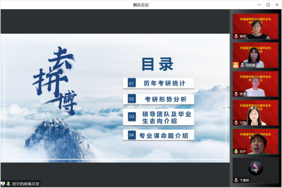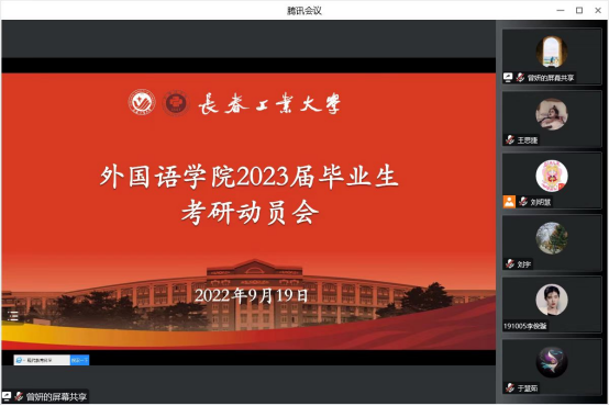 新闻网讯(通讯员 魏瑶)为帮助pg娱乐电子游戏官网入口学子确立考研目标,增强考研信心,解答同学们在考研方面的困惑,pg娱乐电子游戏官网于9月19日晚上19:00,在腾讯会议平台召开“2023届毕业生考研动员会”。pg娱乐电子游戏官网入口院长王轶、副院长曾妍、英语系主任刘宇、俄语系主任张美及全体2023届毕业生参加会议。会议由2023届毕业班辅导员刘明慧主持。