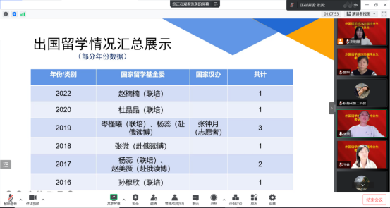 然后,张美为同学们进行了俄语语言文学方向的介绍,就硕导情况、开设课程、出国留学情况、学生就业形势等进行说明,带领同学们了解俄语教育行业的前景和赴俄留学的优惠政策,并叮嘱同学们要集中时间和精力投入到考研复习中,根据自身情况确定适合的复习方案,在专业知识复习方面要点面结合。
