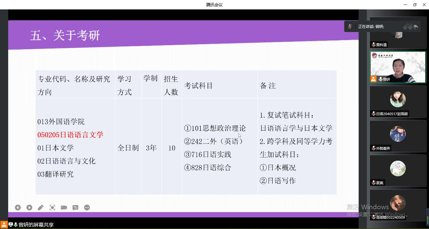 在日语专业组,崔伟老师主持会议。曾妍首先从pg娱乐电子游戏官网入口的发展历史、师资力量、丰富的学术及社会实践活动、研究生奖助体系等方面介绍了pg娱乐电子游戏官网入口外国语言文学一级学科硕士点的概况,然后对日语语言文学方向进行了详细地介绍,分别从师资力量、课程设置、学科优势、学生就业和关于考研五个方面进行讲解,并指出考研是学术和人生方面一次重要的提升机会,希望同学们结合自身实际情况确定适合的考研目标,坚定信念,实现考研梦!最后,崔伟老师对曾妍老师的细致讲解表示衷心的感谢。