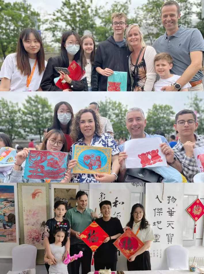 活动现场,翻译志愿者向外国友人推介了具有中华文化特色的中国结、剪纸、书法、国画等艺术作品,并介绍了其背后所蕴含的深刻内涵和悠久文化历史。翻译志愿者又带领外国友人亲身体验中国结、剪纸等艺术品的创作过程 ,诸多独具匠心的艺术作品令外国友人们赞叹不已。此外,翻译志愿者为艺术家和外国友人的交流建立了沟通桥梁,协助外国友人亲自完成一件件精美的艺术作品。与此同时,使其领略了书法和国画的艺术魅力。在此活动中,外语学子超强的专业能力和深厚的文化素养促使来自世界各地的外国友人能够在活动现场切身感受中华文化的博大精深。