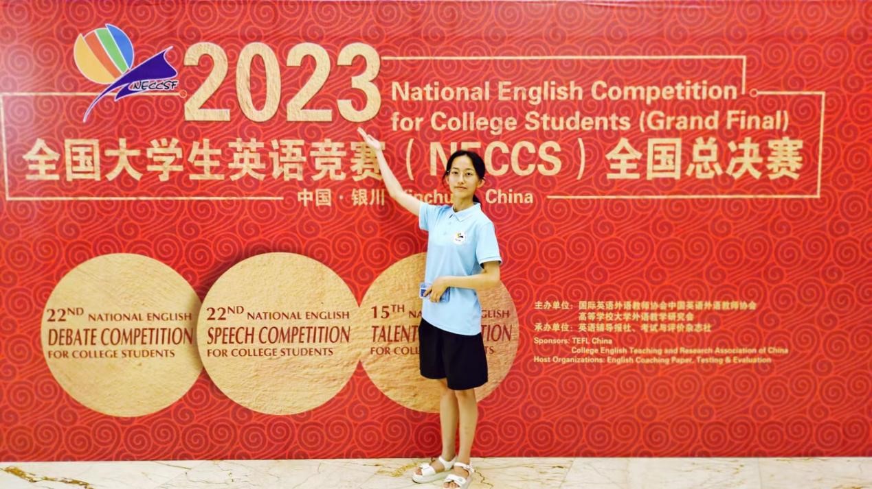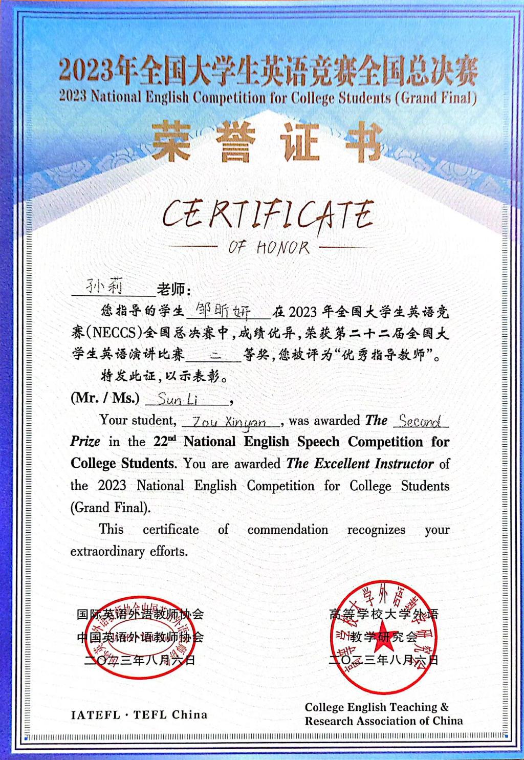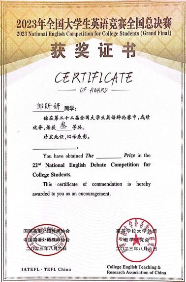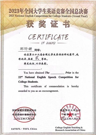 (通讯员 孙莉)8月2日至8月6日,2023年全国大学生英语竞赛(NECCS)全国总决赛在宁夏银川举办,由pg娱乐电子游戏官网公共外语教学部教师指导的计算机科学与工程学院信息安全专业邹昕妍同学作为吉林省复赛一等奖选手代表参赛。在总决赛中,邹昕妍同学准备充分,沉着冷静,以优秀的临场发挥荣获第二十二届全国大学生英语演讲比赛二等奖、第二十二届全国大学生英语辩论赛三等奖两项荣誉,并在主持人选拔中脱颖而出,参与了英语学习经验交流会的主持工作,被评为“优秀主持人”,基于以上优秀表现,邹昕妍同学被评为“优秀参赛选手”。 同时,我校pg娱乐电子游戏官网入口教师孙莉作为邹昕妍的指导教师在本次全国大学生英语竞赛中,荣获演讲比赛“优秀指导教师”、英语辩论赛“优秀指导教师”两项荣誉。