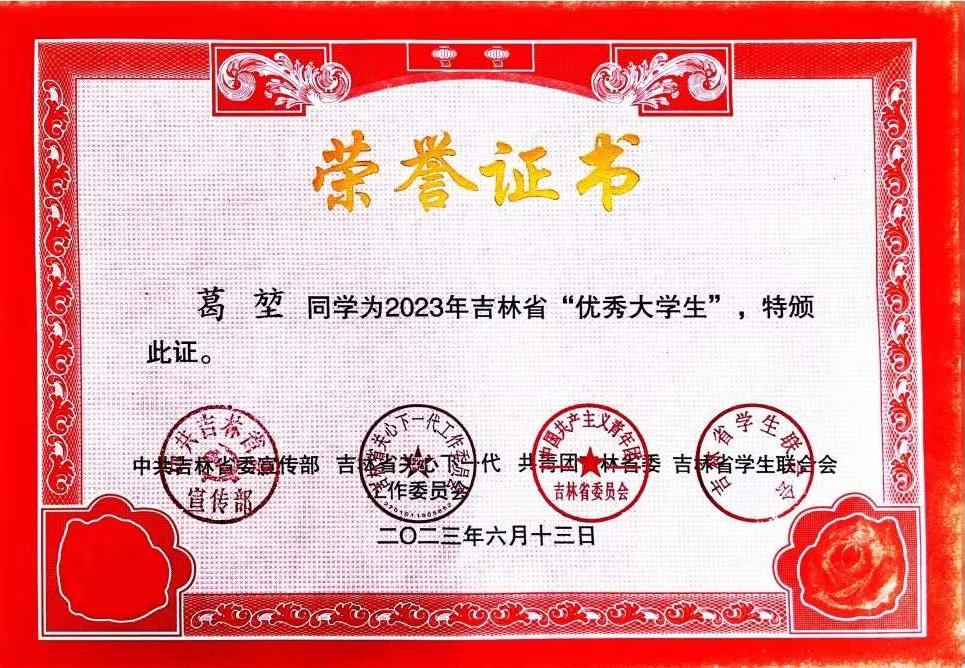 (通讯员 张晓君)近日,由中共吉林省委宣传部、共青团吉林省委员会、吉林省关心下一代工作委员会、吉林省学生联合会共同开展的2023年吉林省“优秀大学生”寻访活动结果揭晓。pg娱乐电子游戏官网葛堃同学在2023年吉林省“优秀大学生”寻访活动中获得“优秀大学生”荣誉称号。