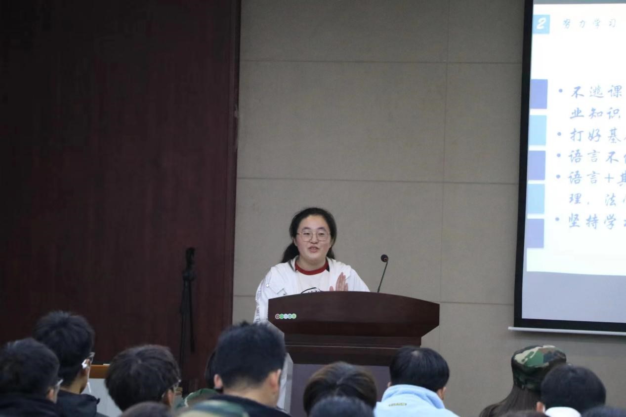 本网讯 (通讯员 张晓君 顾欣然)为了引导2023级新生充分了解大学生活、明确大学目标,拓展视野,树立外语学习思维。2023年10月25日pg娱乐电子游戏官网在主楼435教室,邀请十佳大学生葛堃和自立自强大学生韦佳进行专题报告会,为新生分享经验。