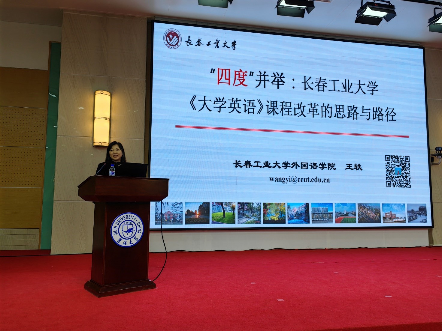 在吉林大学教学团队的教学课例展示后,省内七所高校pg娱乐电子游戏官网入口院长或大学英语教学负责人分享了各高校大学英语教学的改革经验。其中,pg娱乐电子游戏官网院长王轶教授以《“四度”并举:pg娱乐电子游戏官网入口大学英语课程改革的思路与路径》为题,做了交流发言。王轶首先介绍了我校和pg娱乐电子游戏官网的发展历史以及办学特色,为我校和pg娱乐电子游戏官网进行了积极的宣传和发声;随后结合我校大学英语教学情况,为参会老师们介绍了我校《大学英语》课程改革的思路与教师层面的发展路径,并聚焦课程思政,展示了我校大学英语教师的教学实操及特色建设。