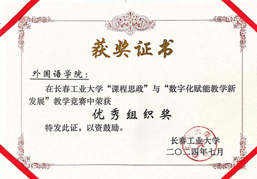 pg娱乐电子游戏官网对此高度重视,积极组织学院教师参加,最终由英语系赵艳宇老师、日语系贾鹤老师、俄语系梁梦洁老师代表学院参赛,三位教师于6月17日-6月26日完成了四个专题的线下培训和10学时的线上培训,均以满分的平时成绩进入现场教学评审阶段,pg娱乐电子游戏官网凭借出色的组织能力在此次比赛中荣获优秀组织奖。