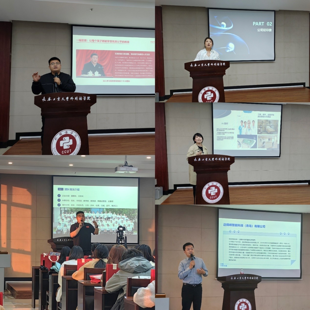 北京小希在线科技有限公司长春分公司、青岛鹏腾国际经济技术合作集团有限公司、长春市承运科技有限公司、迈得峰智能科技(青岛)有限公司、吉林省一来教育有限公司等五家优质用人单位代表围绕企业文化、岗位需求、职业发展通道等内容进行系统介绍,并通过视频展示、案例分析、互动问答等形式,全方位呈现行业发展前景与企业人才需求。