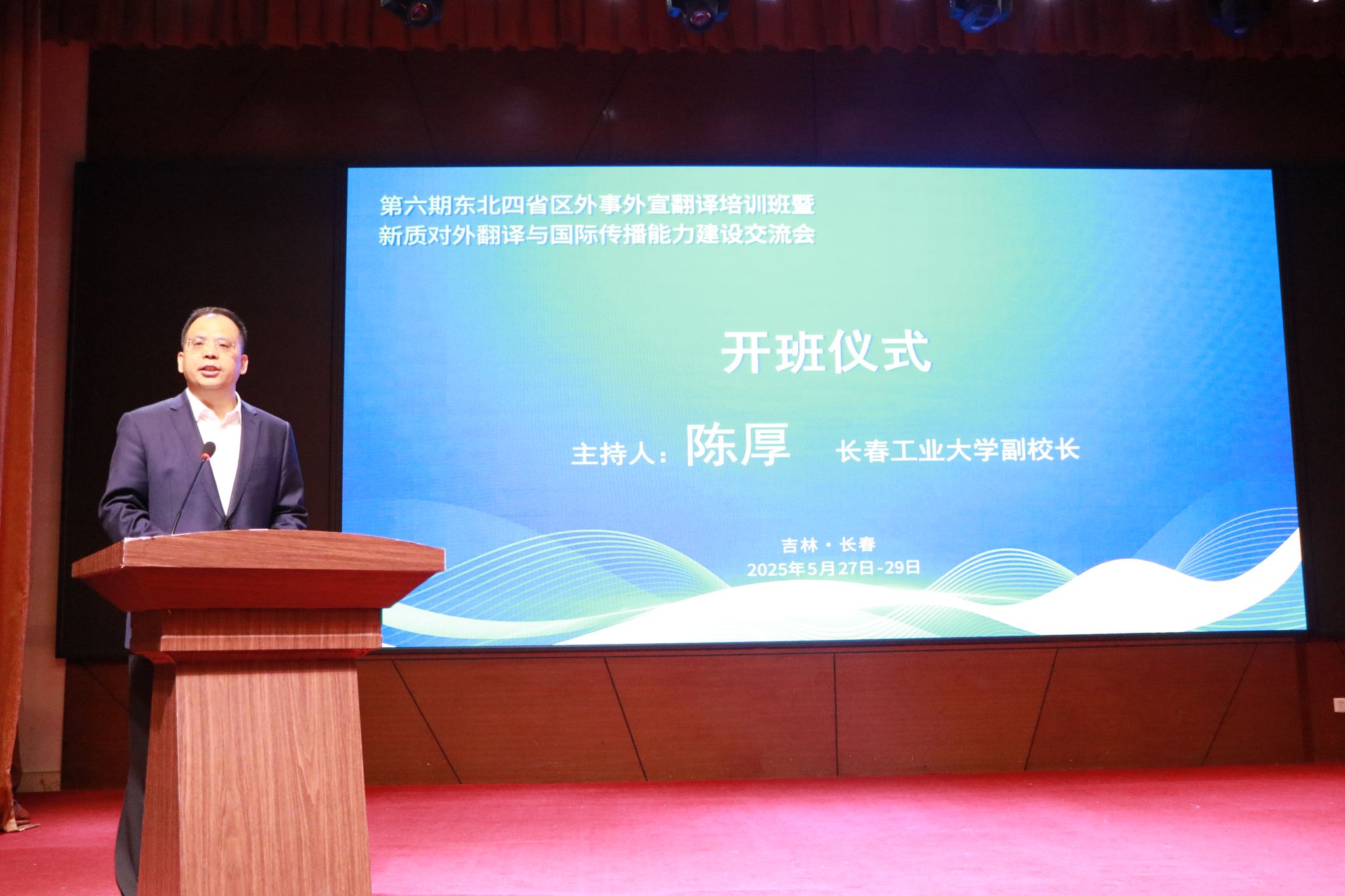 吉林省外事办公室主任郑刚在会上致辞,对我校等承办单位表示感谢,指出,外事外宣和翻译工作作为跨文化交流的重要桥梁,是提升新质对外翻译与国际传播能力的实践主体,做好外事外宣和翻译工作正当其时、大有可为。并希望学员们珍惜学习机会,提升专业素养;加强交流互动,促进共同进步;学以致用,推动事业发展。