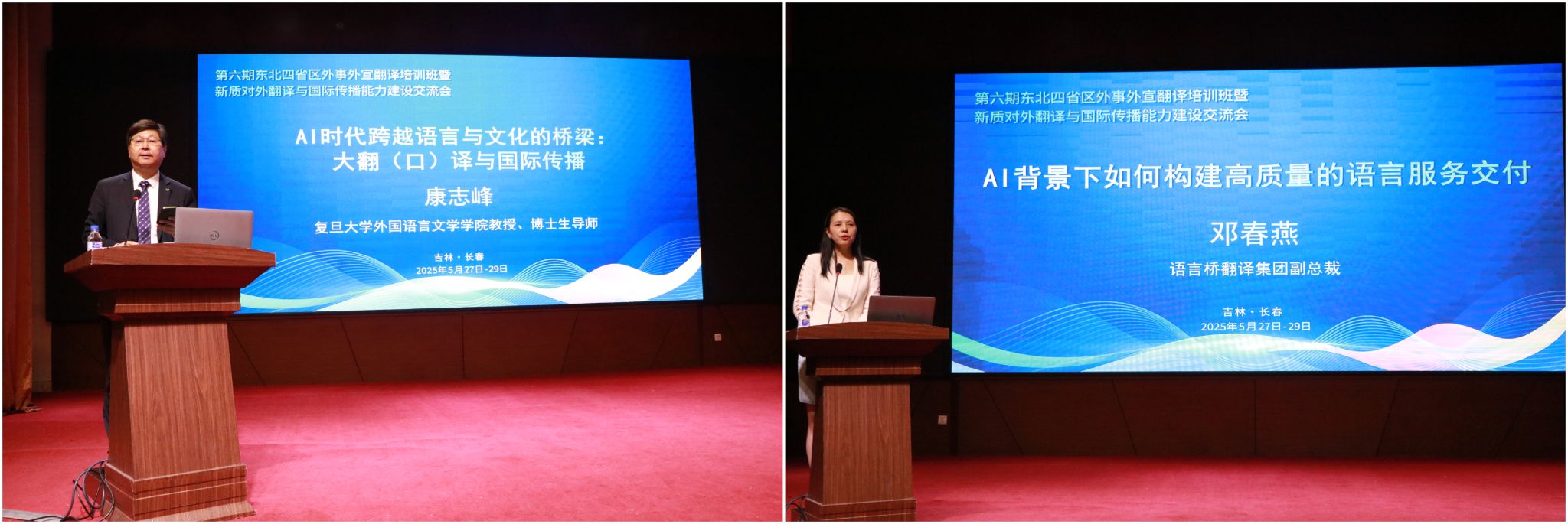 开班仪式结束后,国内2位知名专家作了精彩的主旨交流。复旦大学外国语言文学学院康志峰教授作了题为《AI时代跨越语言与文化的桥梁:大翻(口)译与国际传播》的主旨报告。语言桥翻译集团副总裁邓春燕作了题为《AI背景下如何构建高质量的语言服务交付》的主旨报告。