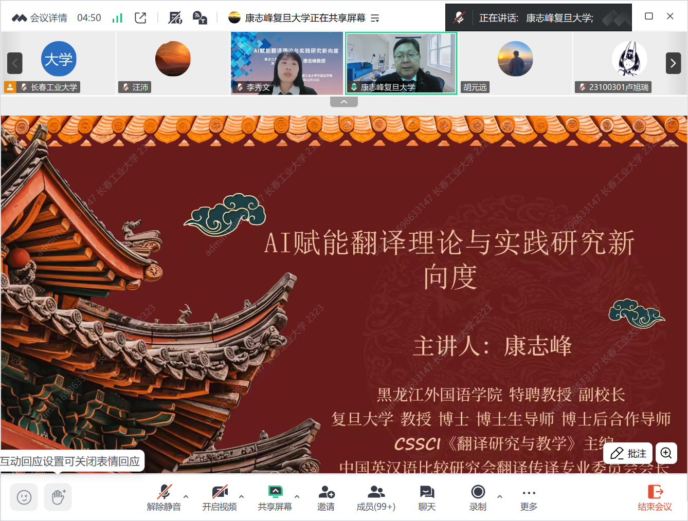 本网讯(通讯员 仲伟磁)10月16日晚,黑龙江pg娱乐电子游戏官网入口副校长、复旦大学博士生导师、博士后合作导师康志峰教授应邀为pg娱乐电子游戏官网师生线上作了题为《AI赋能翻译理论与实践研究新向度》的学术报告。学院院长李秀文、副院长曾妍、各系部教师、研究生及本科生近500人聆听了这场精彩的学术报告会,会议由李秀文主持。