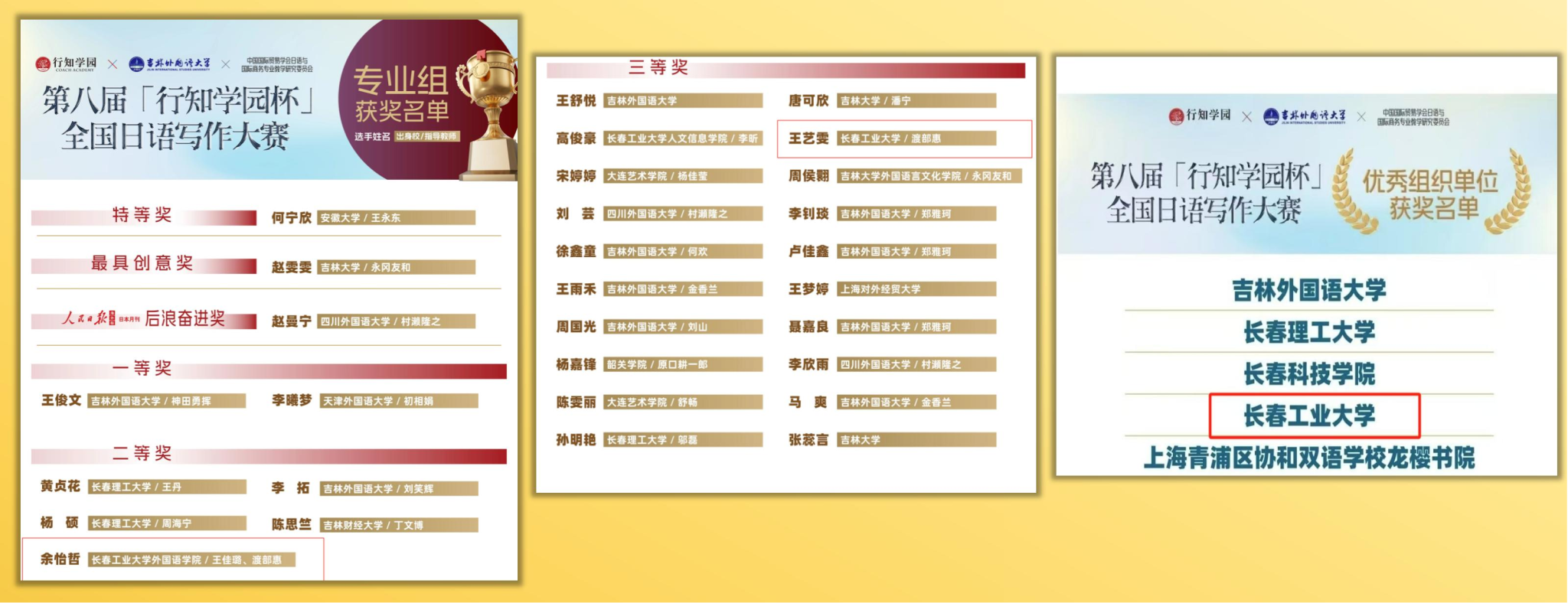 本网讯(通讯员 李雪)近日,第八届“行知学园杯”全国日语写作大赛顺利落下帷幕。pg娱乐电子游戏官网入口日语系余怡哲同学(指导教师:王佳璐、渡部惠)获专业组二等奖,王艺雯同学(指导教师:渡部惠)获专业组三等奖,我校荣获“优秀组织单位奖”。