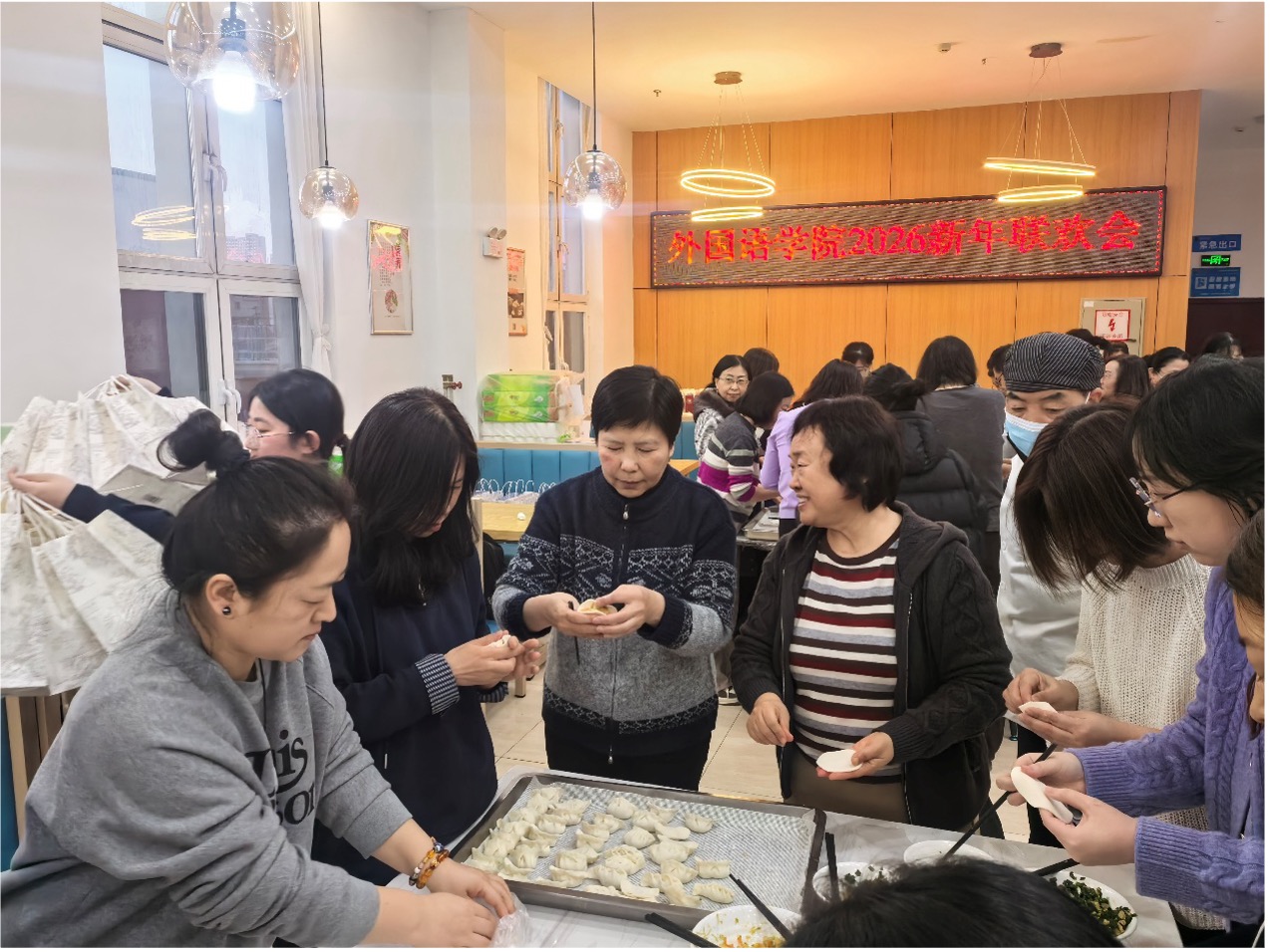 饺香暖冬,礼赠温情。游戏环节结束后,教师们齐聚食堂教职工餐厅,共同参与包饺子活动。大家自发分工、巧手协作,在融洽的氛围中交流过去一年的教学心得与生活感悟,畅谈对2026马年的美好期待,欢声笑语驱散了冬日寒意。学院为参与教师准备了精美奖品,承载着对教职工辛勤付出的认可,也寄托着“马年顺遂”的诚挚祝愿,暖意融融,情满外院。