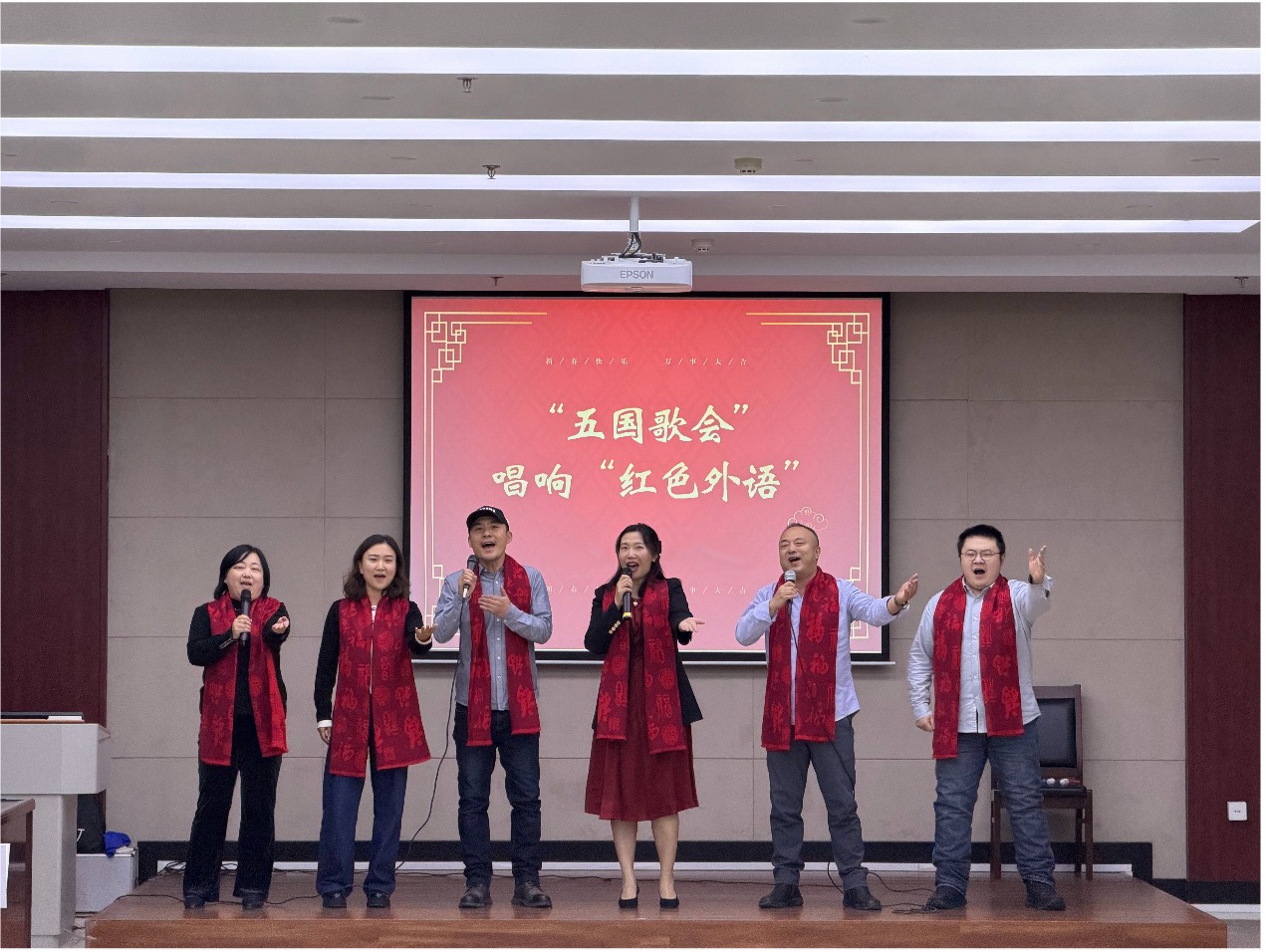 红韵开篇,声动人心。联欢会以“五国歌会”红色外语演唱环节正式拉开帷幕。李笑、宋卓时、万丽娜、张晓薇、刘冬林、林瑛六位教师携手登台,分别运用中、俄、英、日、韩五种语言深情演绎经典曲目,巧妙将外语专业特色与文化艺术深度融合。悠扬歌声传递真挚情感,既生动彰显了外语教育工作者的专业底蕴与时代风采,更以多元语言载体唱响家国情怀,为整场联欢会奠定了昂扬向上的基调。