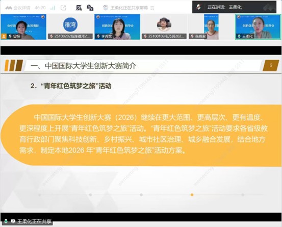 王柔化教授结合自身多年评审实践经验,围绕中国国际大学生创新大赛、中国青年创青春大赛、“挑战杯”竞赛等重点赛事,从比赛赛制赛程、项目选题定位、商业计划书撰写规范、路演展示技巧、核心团队组建等关键环节进行系统阐释。她重点拆解赛事评审的核心考察维度,深入浅出地解析项目打磨过程中的重点难点问题及对应解决路径。有效厘清师生参赛思路,为赛事筹备工作提供了科学可行的指导方案。