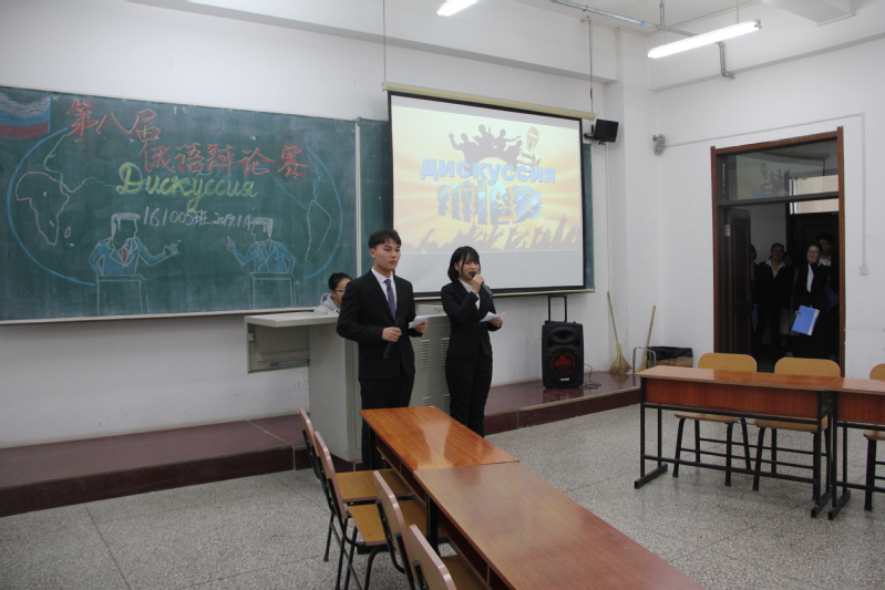 在大二同学美妙动听的开场歌声中,大赛开始。两位主持激情昂扬的中俄双语开场白后,辩论赛正式拉开帷幕。